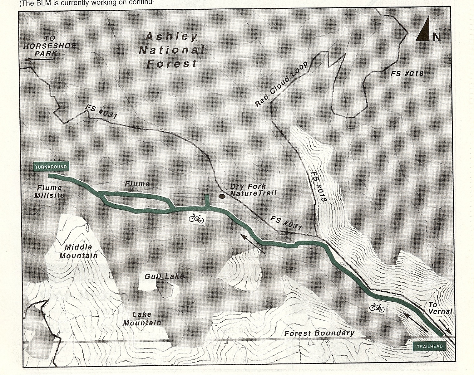 From Vernal, go west on 500 North, past Uintah High School to 3500 West in Maeser. Turn north and follow that road approximately 12 miles until the pavement ends and gravel begins at the Ashley National Forest boundary. Park at the small parking area on the right side and start biking or hiking where the trail starts on the left side. The trail consists of sections of level and rolling two track and sections of steep and technical single track plus two creek crossings. The last stretch of 3 miles is a grueling climb before it levels out near the mill site.