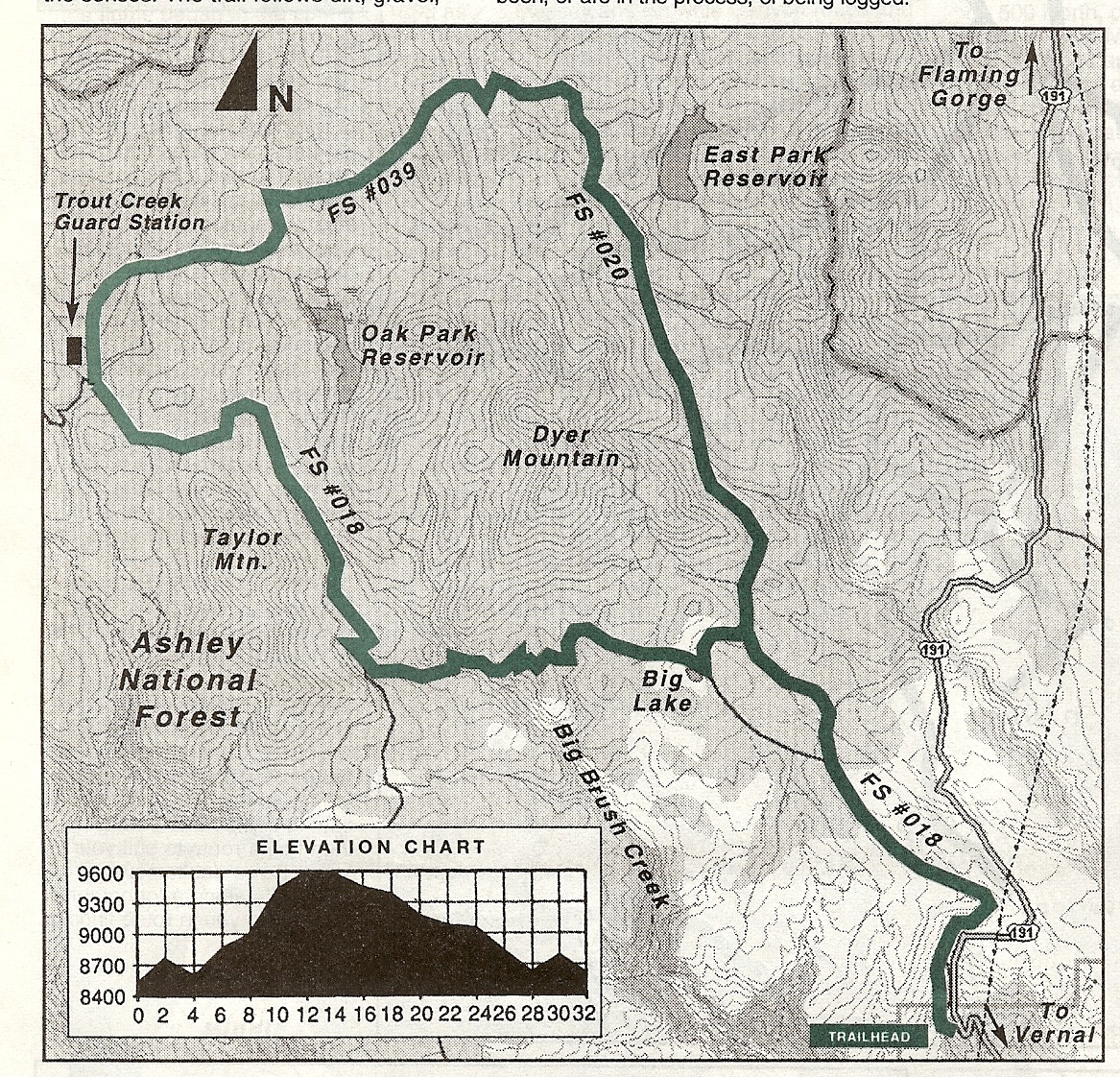 From Vernal, head north 18 miles along US 191 and turn left (west) onto the Red Cloud Loop (FS 018). Park in the gravel parking area here. The trailhead is signed and the route follows bike trail signs. Following the route counterclockwise, head northwest up paved East Park Road for 9.5 miles to the East Park Campground turnoff. Water may be available at the campground in summer. The road changes to gravel and rolls west for 10 miles across several drainages to the Trout Creek guard station. Be aware of logging trucks in this area. Turn left at the guard station, following the bike signs back to US 191. After 7 miles the route crosses Big Brush Creek and continues for 4 miles through aspen groves, stands of lodge pole pine and sagebrush back to the highway and your vehicle.