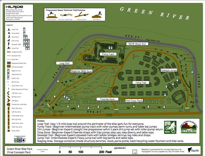 From Hwy 80, take exit 91 Green River/WY-530/E Flaming Gorge Way, Merge onto E Flaming Gorge Way, take ramp onto Uinta Dr., turn left on Monroe Ave, stay straight when Monroe Ave. becomes dirt and enters Stratton-Myers Park, drive to end of the road and park. The Green River Bike Park is across the creek just south of the parking lot.