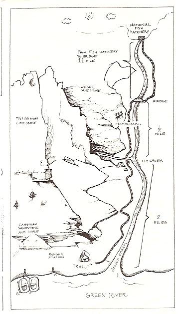 From Vernal, proceed north on US Hwy 191. About a mile north, looked for a marked right-hand turn. Follow this paved road about 40 miles to the Jones Hole National Fish Hatchery. Park here and wander down through the concrete fish rearing pens. Look for the trail register and signboard - the four-mile trail starts here following Jones Creek , which begins as a spring at the National Fish Hatchery. Shady box elder trees and lush greenery surround along some portions of the trail, on other short stretches you find dry grassland flats sprinkled with sagebrush, juniper and cactus. The hiking is easy since the trail stays fairly level, changing only 200 feet in elevation. The walls of the canyon tower overhead almost 2,000 feet high. After about 1 3/4 miles, a short marked side trail leads you to remnants of the ancient Fremont Indian culture (shelter site & pictographs). After 2 miles, Ely Creek comes in from a side canyon and some picnic tables make for a great lunch spot. Jones Hole was named by famed explorer John Wesley Powell on his historic 1871 expedition down the Green River. But local residents say the name really took hold after an incident in 1883 involving a burly fellow named Charlie Jones. Believing that he had killed a man, Charley hid out here for a winter. When he later heard that the man had lived and he had not killed anyone, Charley in relief exclaimed, "You mean I can finally get out of this Hole?" And thus the name.